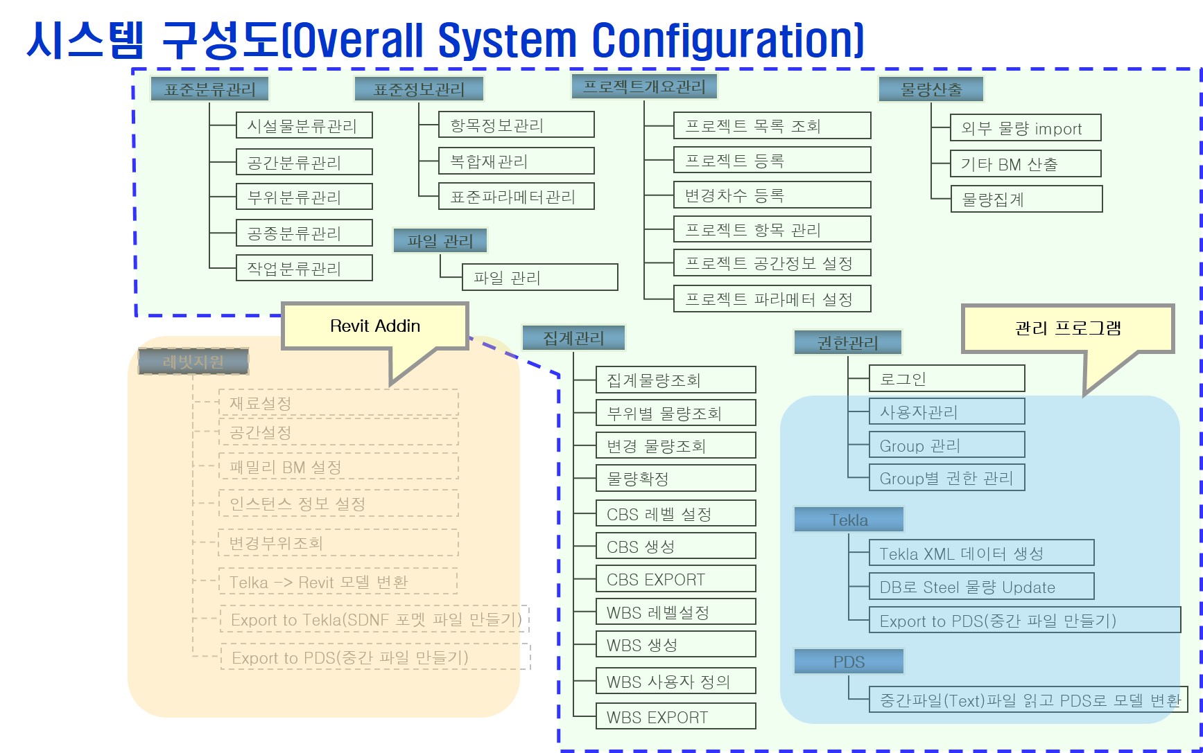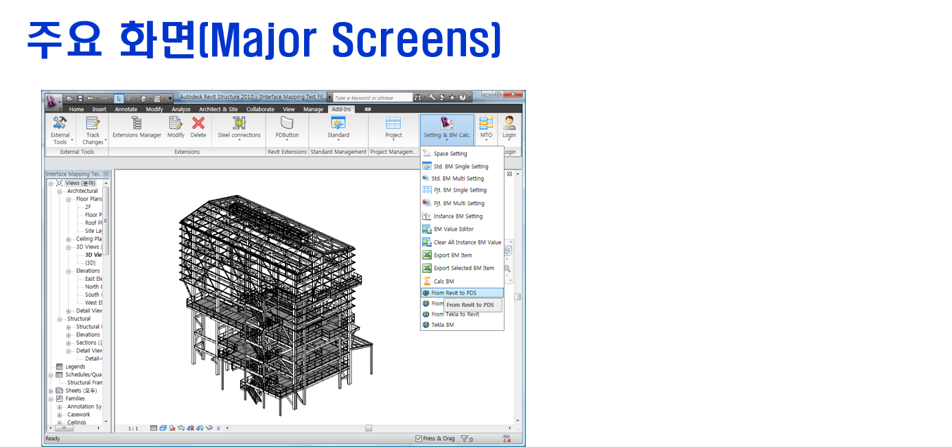 Autodesk사의 건축 모델링 프로그램인 Revit기반의 BIM 시스템. Revit에서 Family기반의 모델링을 이용한 BM 자동 산출 및 통합관리 시스템으로서 협력사 및 관련 부서에서 통합적으로 사용할 수 있도록 구성되어 있다. Model은 Tekla 및 PDS와 편리하게 전환할 수 있도록 기능이 되어 있어 업무 단계별 불필요한 모델링작업도 최소화 할 수 있다.