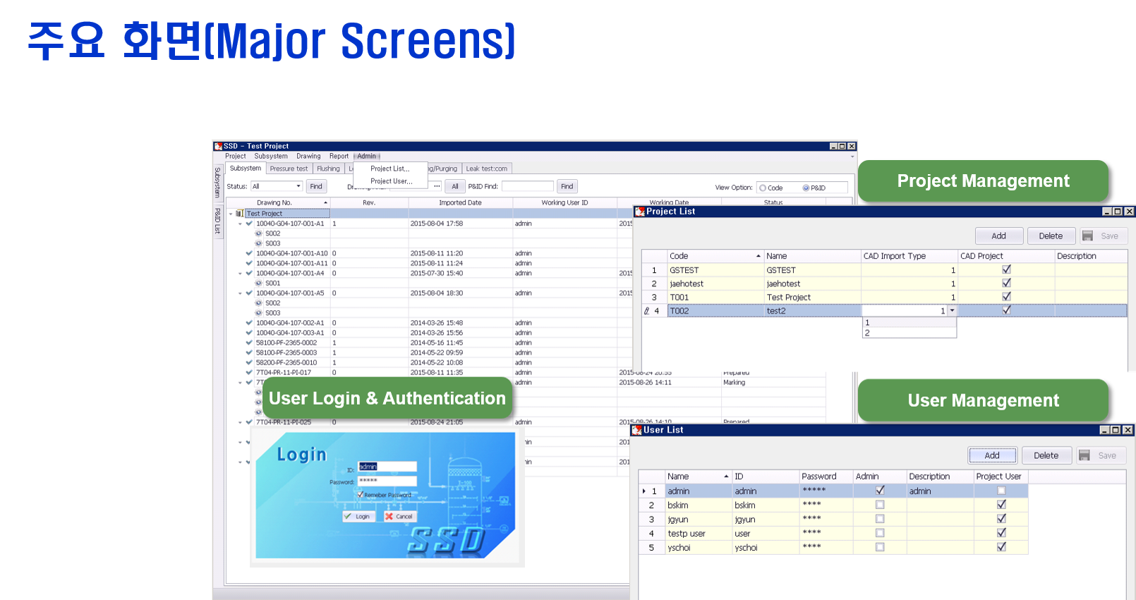 시운전 팀에서 Sub System 및 Test Package 정보를 P&ID에 보다 편리하고 빠르게 입력(Mark-up)하고 그 도면과 데이터의 이력을 관리해 주는 플랜트 시운전을 위한 Utility 시스템이다. 시운전 엔지니어 업무효율을 향상시키고, 공정/시운전 엔지니어 업무 절차를 개선한다.
