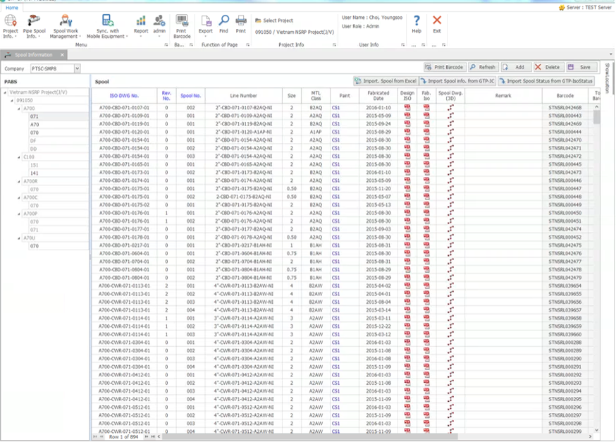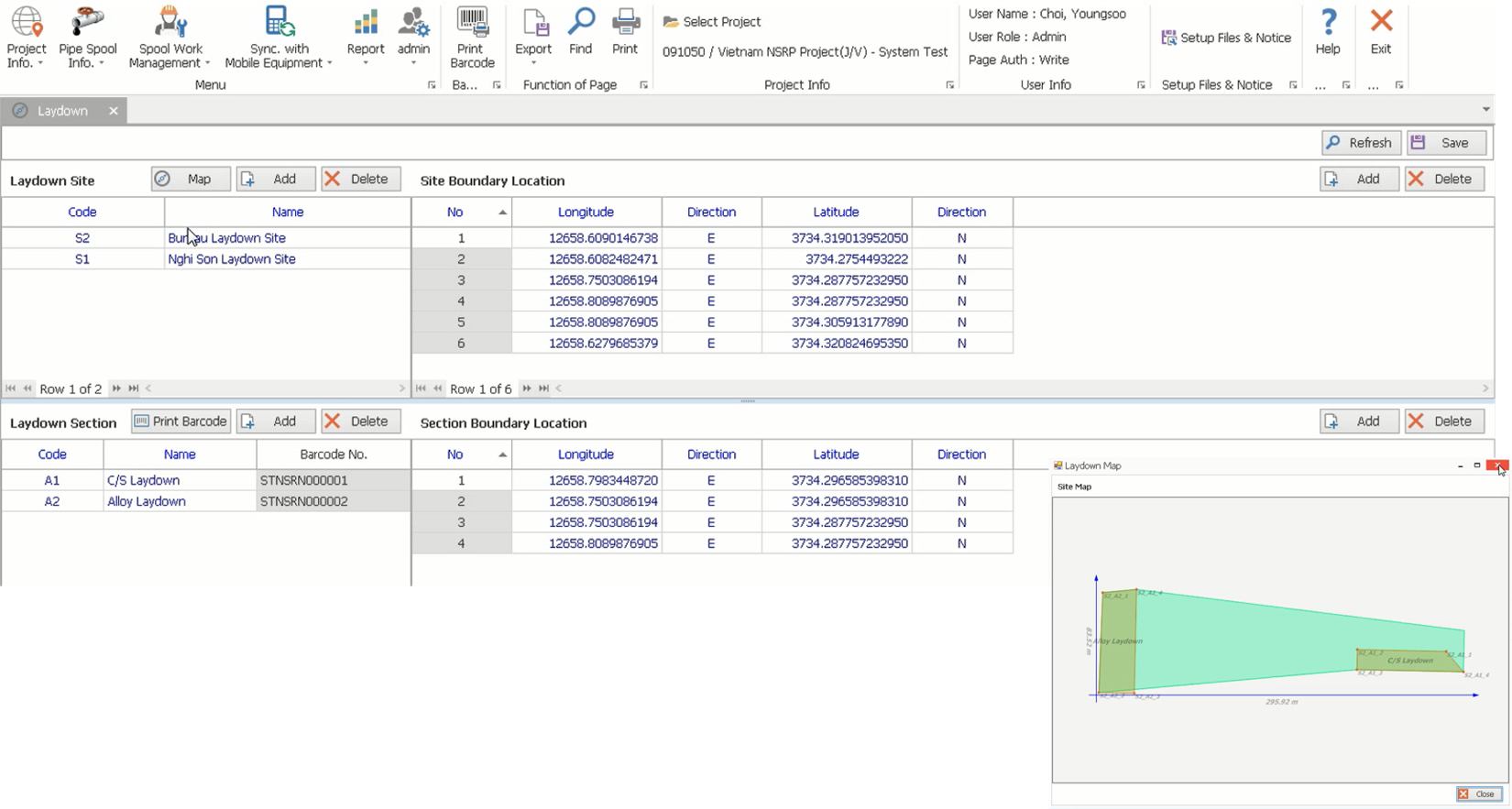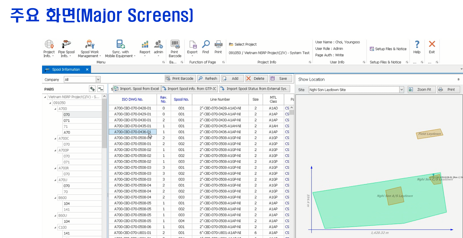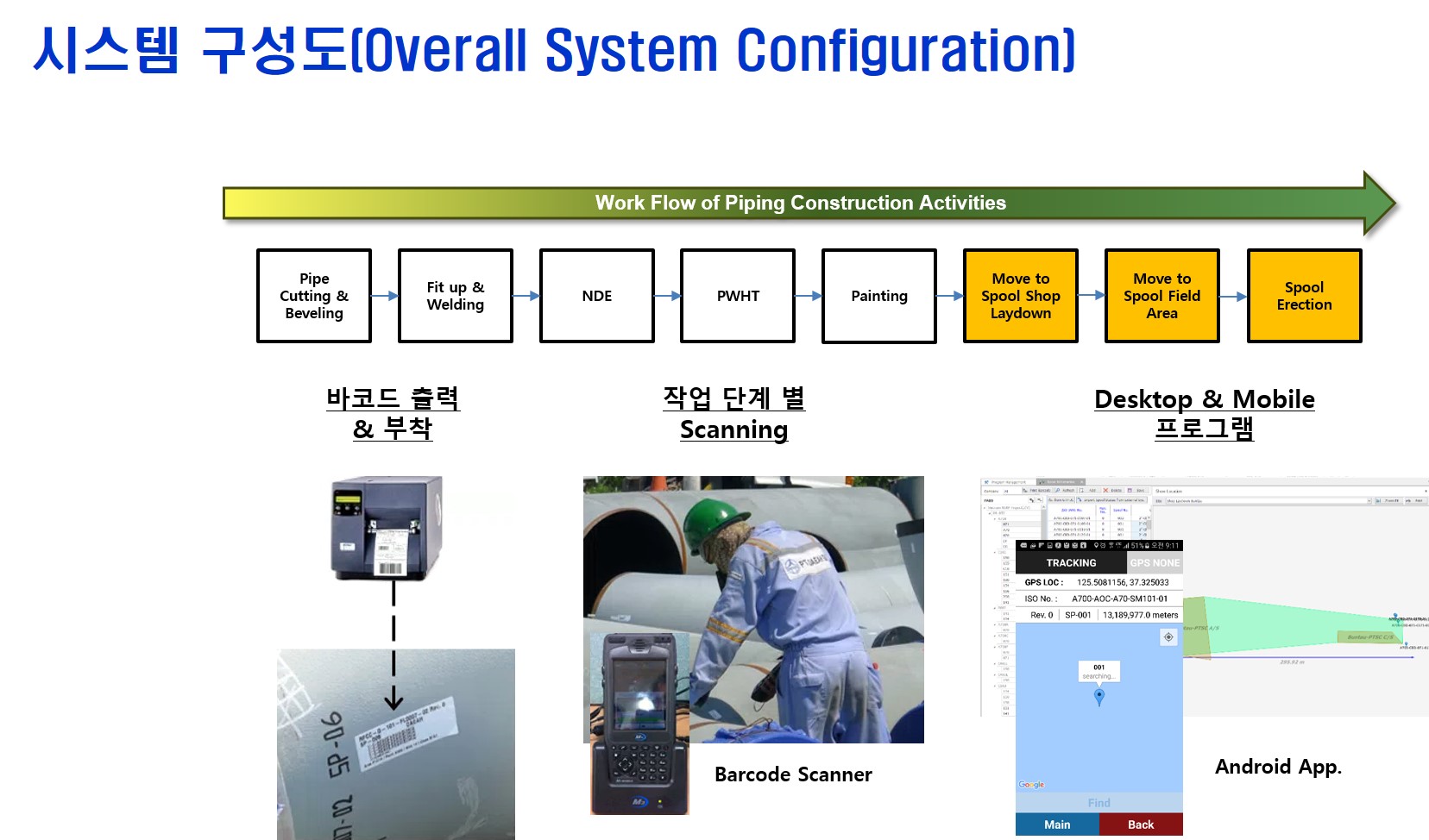 플랜트 현장의 주요 Material 인 Pipe Spool 의 자재 분실을 방지하고 관리 현황을 파악하기 위해 개별 Material 에 고유 Number를 부여한 바코드를 부착하고 해당 Material 이 보관된 위치에서 안드로이드 모바일 기기로 바코드를 스캔하여 각 Material 의 GPS좌표를 저장함