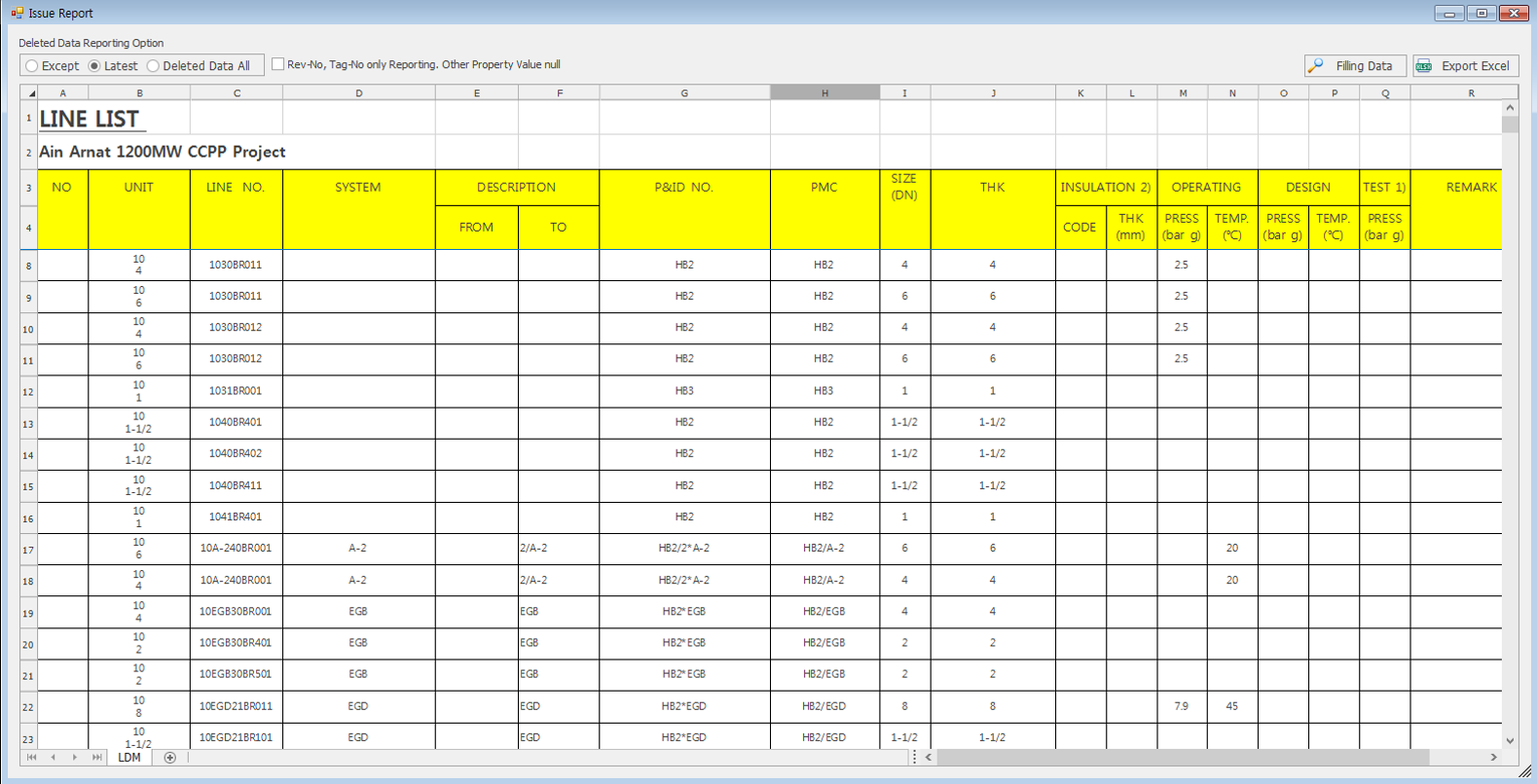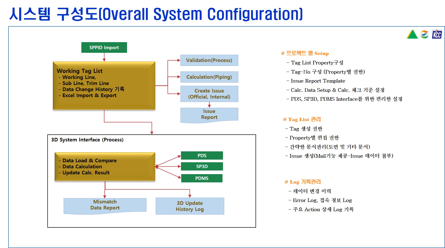 배관 설계 데이터 관리 시스템으로 Tag List관리, 검증 및 자동계산이 이루어지며 PDS, SP3D, PDMS 시스템을 연계하여 데이터 비교 및 Update기능을 제공한다.
