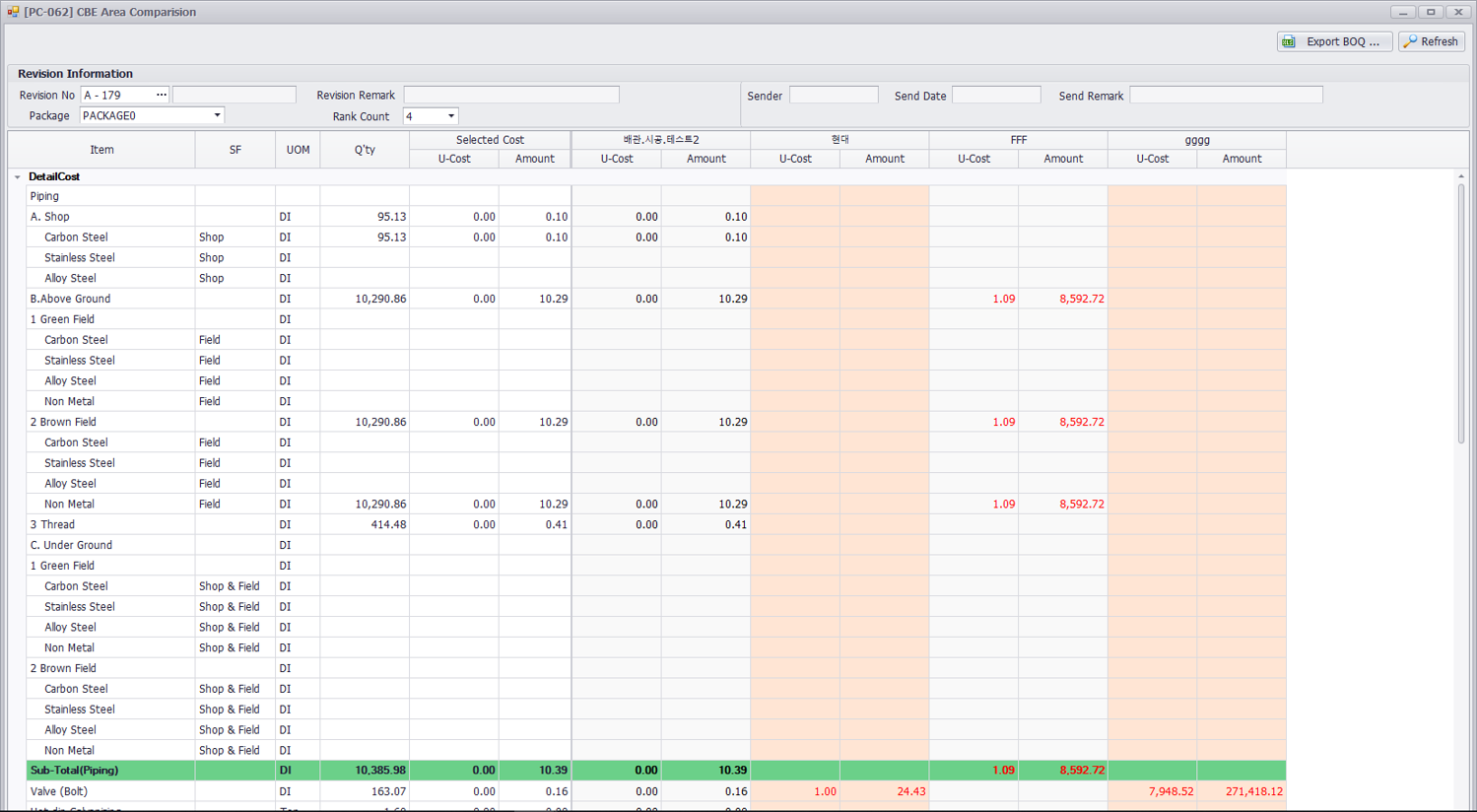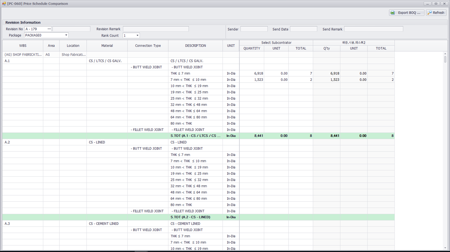 배관, 전기, 계장, 건축, 토목, 기계, 철골 표준 양식을 통한 설계, 구매, 운송, 시공 BOQ 통합 관리.