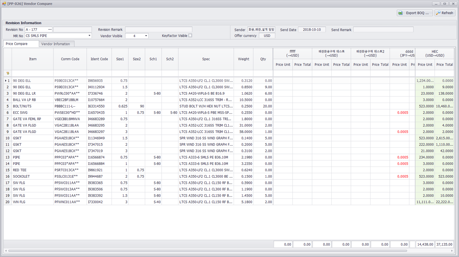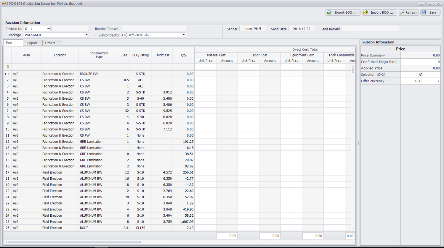 기자재 견적 관리 (배관, 전기, 계장, 기계)