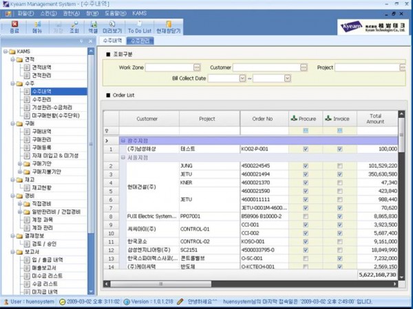 Kyeam Technologies Management Information System is the comprehensive system that supports enterprise management and decision making for an executive. It builds a database that enables comprehensive management and processing of materials, and performs features such as estimate / order / purchase / inventory / approval processing, select processing, generating reports, electronic document management.